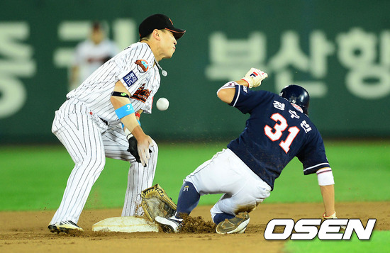 13일 오후 부산 사직구장에서 열린 2012 팔도 프로야구 롯데 자이언츠와 두산 베어스의 경기 6회초 1사 1루 두산 손시헌의 타석때 1루 주자 정수빈이 도루 성공하고 있다.