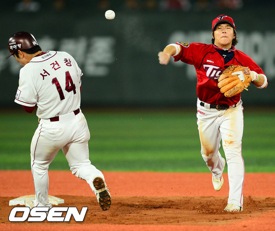 13일 오후 목동구장에서 열린 '2012 팔도 프로야구' 넥센 히어로즈와 KIA 타이거즈의 경기에서 4회말 1사 주자 1루 넥센 이택근의 2루수 앞 병살타때 KIA 유격수 김선빈이 2루에서 서건창을 포스아웃 시킨 후 1루로 송구하고 있다.