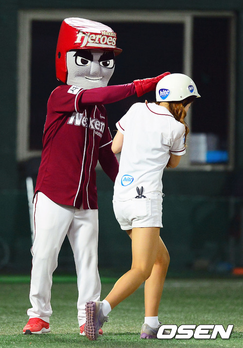 13일 오후 목동구장에서 열린 '2012 팔도 프로야구' 넥센 히어로즈와 KIA 타이거즈의 경기에서 4회말 1사 주자 2루 넥센 서건창이 파울 타구를 날렸을때 넥센 배트걸 민수진이 배트를 치우자 턱돌이에게 혼나고 있다.