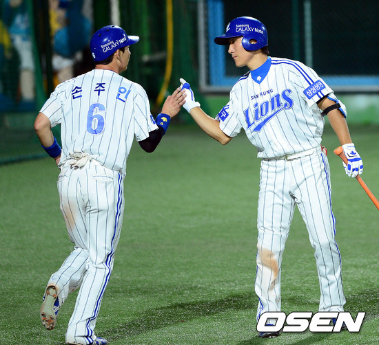 13일 오후 대구 시민구장에서 열린 '2012 팔도 프로야구' 삼성 라이온즈와 한화 이글스의 경기 5회말 1사 1,2루 김상수의 1타점 적시타에 홈을 밟은 손주인이 덕아웃으로 향하며 배영섭과 하이파이브를 하고 있다.