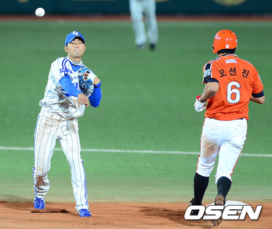 13일 오후 대구 시민구장에서 열린 '2012 팔도 프로야구' 삼성 라이온즈와 한화 이글스의 경기 6회초 1사 1루 장성호의 병살타구를 유격수 김상수가 1루로 송구하고 있다.
