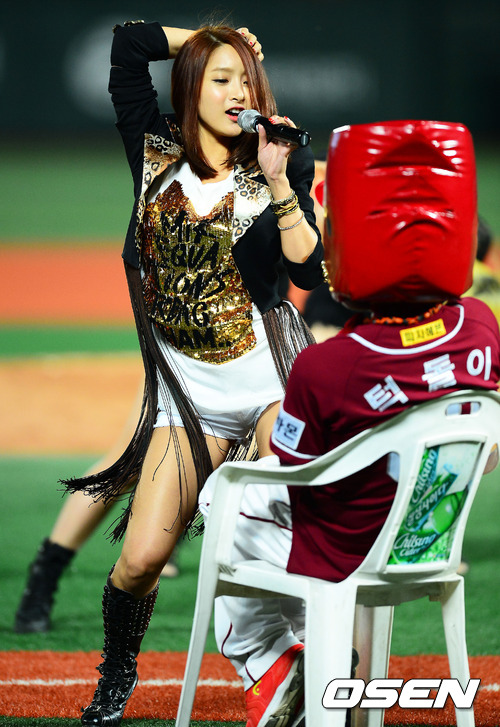 13일 오후 목동구장에서 열린 '2012 팔도 프로야구' 넥센 히어로즈와 KIA 타이거즈의 경기에서 넥센 김소리가 클리닝 타임 공연때 턱돌이 앞에서 섹시댄스를 추고 있다.