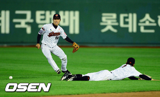 13일 오후 부산 사직구장에서 열린 2012 팔도 프로야구 롯데 자이언츠와 두산 베어스의 경기 7회초 2사 만루 롯데 이승화 좌익수가 두산 이성열을 타구를 놓치고 있다. 그 사이 두산 주자 3명이 득점.