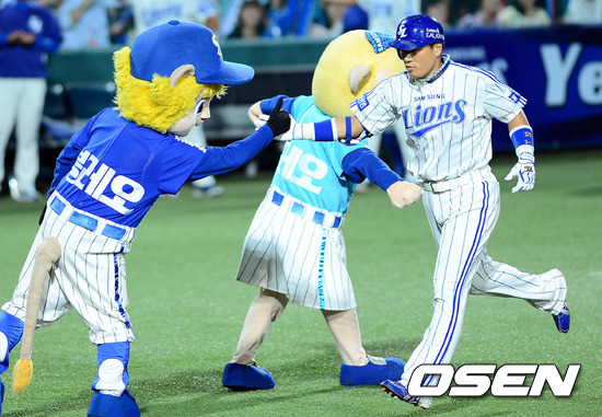 13일 오후 대구 시민구장에서 열린 '2012 팔도 프로야구' 삼성 라이온즈와 한화 이글스의 경기 6회말 1사 이승엽이 솔로포를 친 후 베이스를 돌며 마스코트와 하이파이브를 하고 있다.