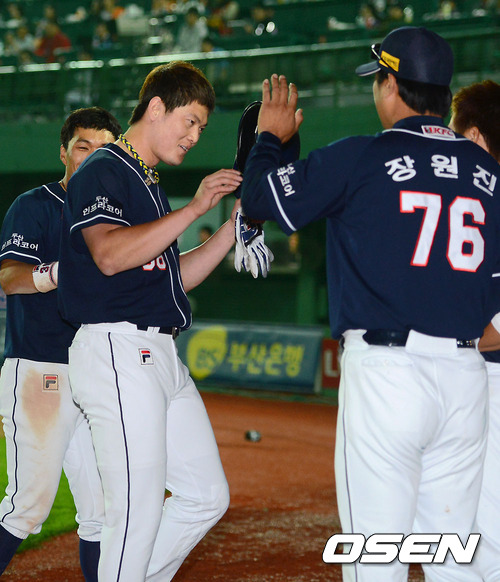 13일 오후 부산 사직구장에서 열린 2012 팔도 프로야구 롯데 자이언츠와 두산 베어스의 경기 7회초 2사 만루 롯데 이승화 좌익수가 두산 이성열을 타구를 놓쳤다. 이성열이 허경민과 교체된 후 동료들의 축하를 받고 있다.