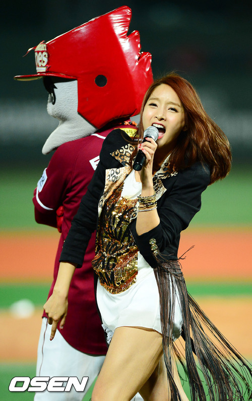13일 오후 목동구장에서 열린 '2012 팔도 프로야구' 넥센 히어로즈와 KIA 타이거즈의 경기에서 넥센 김소리가 클리닝 타임 공연때 턱돌이 앞에서 섹시댄스를 추고 있다.