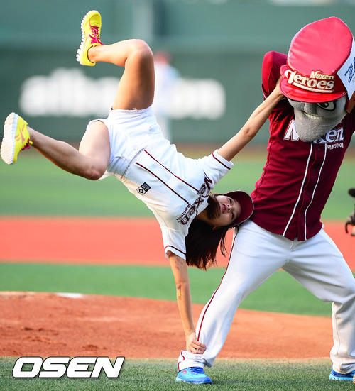 13일 오후 목동구장에서 열린 '2012 팔도 프로야구' 넥센 히어로즈와 KIA 타이거즈의 경기에서 시구를 위해 마운드에 오른 가수 김소리가 턱돌이를 이용한 묘기를 선보이고 있다.