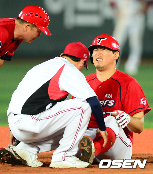 13일 오후 목동구장에서 열린 '2012 팔도 프로야구' 넥센 히어로즈와 KIA 타이거즈의 경기에서 7회초 2사 주자 없는 상황에서 KIA 최희섭이 좌익수 왼쪽 2루타를 날린 후 2루에 몸을 날리며 세이프됐다. 이 과정에서 최희섭의 발목이 약간 꺾여 고통을 호소하고 있다.