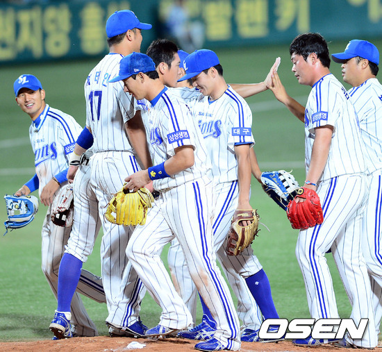 13일 오후 대구 시민구장에서 열린 '2012 팔도 프로야구' 삼성 라이온즈와 한화 이글스의 경기 종료 후 삼성 선수들이 하이파이브를 하고 있다.