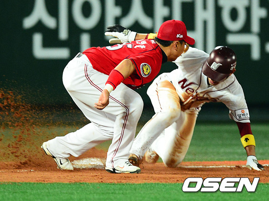 13일 오후 목동구장에서 열린 '2012 팔도 프로야구' 넥센 히어로즈와 KIA 타이거즈의 경기에서 7회말 무사 주자 2루 넥센 이택근 타석에서 폭투때 2루 주자 서건창이 3루로 뛰었으나 3루에서 KIA 3루수 이범호에게 태그아웃당하고 있다.
