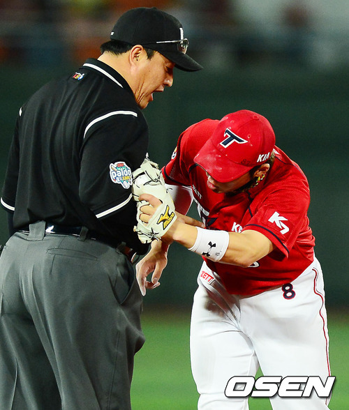 13일 오후 목동구장에서 열린 '2012 팔도 프로야구' 넥센 히어로즈와 KIA 타이거즈의 경기에서 7회말 2사 주자 1루 넥센 강정호 타석에 1루 주자 이택근이 2루 도루에 성공하자 KIA 2루수 안치홍이 최수원 2루심에게 항의하며 글러브로 밀치고 있다.
