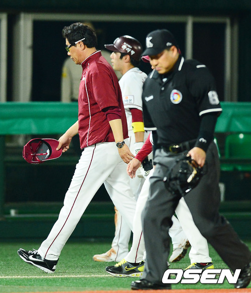 13일 오후 목동구장에서 열린 '2012 팔도 프로야구' 넥센 히어로즈와 KIA 타이거즈의 경기에서 7회말 무사 주자 2루 넥센 이택근 타석에서 폭투때 2루 주자 서건창이 3루로 뛰었으나 3루에서 KIA 3루수 이범호에게 태그아웃당했다. 이에 서건창이 오심이라고 항의하고 넥센 김시진 감독이 그라운드에 나와 항의를 한 후 들어가고 있다.