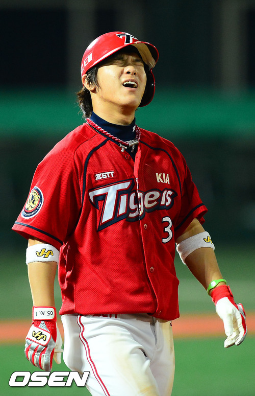 13일 오후 목동구장에서 열린 '2012 팔도 프로야구' 넥센 히어로즈와 KIA 타이거즈의 경기에서 8회초 2사 주자 2,3루 KIA 김선빈이 투수 앞 땅볼로 아웃되자 아쉬워하고 있다.