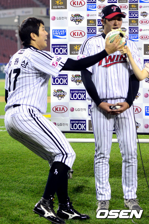 경기 종료 후 LG 유원상이 이승우의 프로 데뷔 첫 승을 축하해주고 있다. / youngrae@osen.co.kr