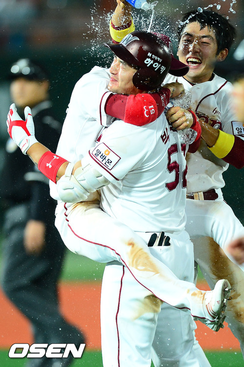 경기를 마치고 넥센 박병호가 물세례를 받고 있다. / rumi@osen.co.kr