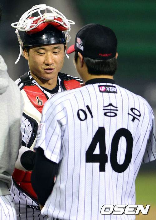 경기 종료 후 LG 김태군이 이승우의 프로 데뷔 첫 승 기념 볼을 챙겨주고 있다. / youngrae@osen.co.kr