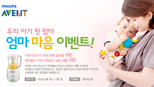 ㈜필립스전자의 육아용품 브랜드 '필립스 아벤트'의 이유식 마스터가 전국 500명 임산부와 산모를 대상으로 진행한 소비자 조사에서 이유식 조리기 부문 판매 점유율과 구매 선호 제품 1위를 차지해 눈길을 끌었다.