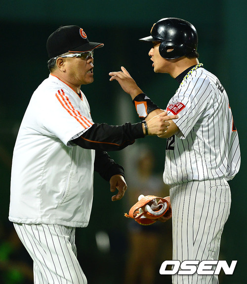 14일 오후 부산 사직구장에서 열린 2012 팔도 프로야구 롯데 자이언츠와 두산 베어스의 경기 7회말 무사 1루 롯데 김주찬이 두산 김강률 투수의 공에 맞았다.하지만 오석환 구심이 공에 맞지 않았다고 판정하자 김주찬과 양승호 감독이 항의하고 있다.