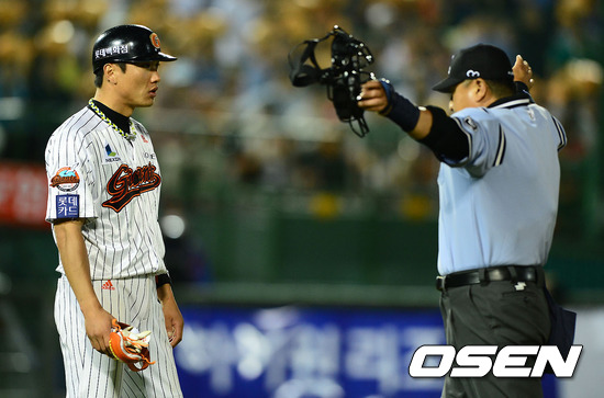 14일 오후 부산 사직구장에서 열린 2012 팔도 프로야구 롯데 자이언츠와 두산 베어스의 경기 7회말 무사 1루 롯데 김주찬이 두산 김강률 투수의 공에 맞았다.하지만 오석환 구심이 공에 맞지 않았다고 판정하자 김주찬이 항의하고 있다.