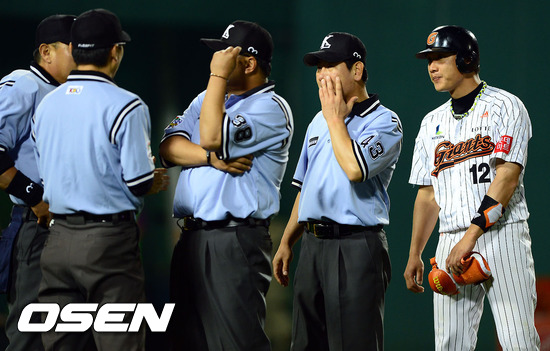 14일 오후 부산 사직구장에서 열린 2012 팔도 프로야구 롯데 자이언츠와 두산 베어스의 경기 7회말 무사 1루 롯데 김주찬이 두산 김강률 투수의 공에 맞았다. 사심이 모여 판정을 논의하고 있다.