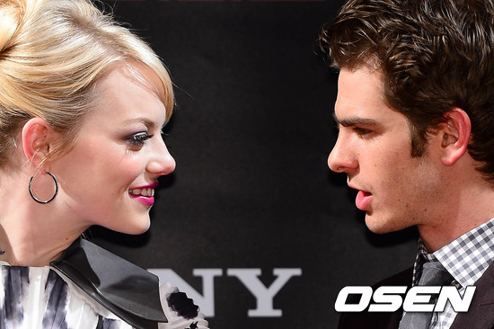 14일 오후 서울 강서구 롯데시네마 김포공항에서 열린 영화 '어메이징 스파이더맨'(감독 마크 웹) 레드카펫 & 프리미어 행사에서 할리우드 배우 엠마 스톤과 앤드류 가필드가 바라보며 이야기를 나누고 있다.