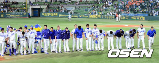 13일 오후 대구 시민구장에서 열린 '2012 팔도 프로야구' 삼성 라이온즈와 한화 이글스의 경기 종료 후 삼성 선수들이 관중들에게 인사를 하고 있다.