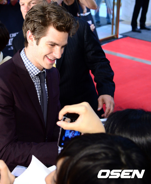 14일 오후 서울 강서구 롯데시네마 김포공항에서 열린 영화 '어메이징 스파이더맨'(감독 마크 웹) 레드카펫 & 프리미어 행사에서 할리우드 스타 앤드류 가필드가 팬들에게 사인을 해주고 있다.