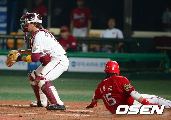 14일 오후 서울 목동구장에서 열린 2012 팔도 프로야구 넥센 히어로즈와 KIA 타이거즈와의 경기 8회초 1사 2루 김원섭 좌익수앞 안타때 2루 주자 이용규 홈까지 뛰어 득점을 올리고 있다.