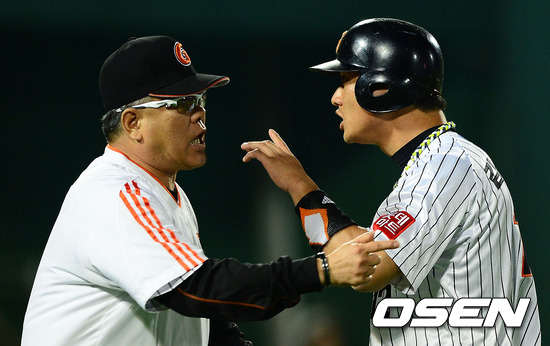 14일 오후 부산 사직구장에서 열린 2012 팔도 프로야구 롯데 자이언츠와 두산 베어스의 경기 7회말 1사 롯데 김주찬이 몸에 맞는 공 판정에 항의하고 있다.