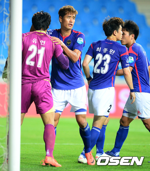 전반 유현이 페널티킥을 막아내고 동료선수들의 축하를 받고 있다. /jpnews@osen.co.kr