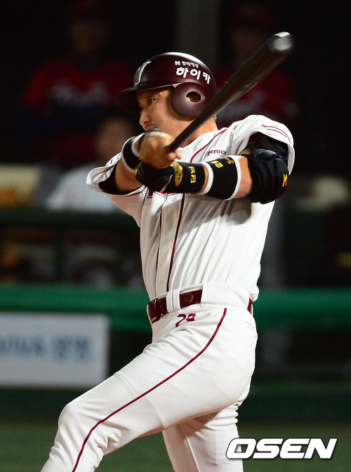 14일 오후 서울 목동구장에서 열린 2012 팔도 프로야구 넥센 히어로즈와 KIA 타이거즈와의 경기 8회말 2사 1,2루 이택근 1타점 적시타를 날리고 있다.