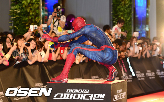 14일 오후 서울 강서구 롯데시네마 김포공항에서 열린 영화 '어메이징 스파이더맨'(감독 마크 웹) 레드카펫 & 프리미어 행사에서 스파이더맨 복장을 한 액션 배우가 팬들 앞에서 화려한 액션을 선보이고 있다.