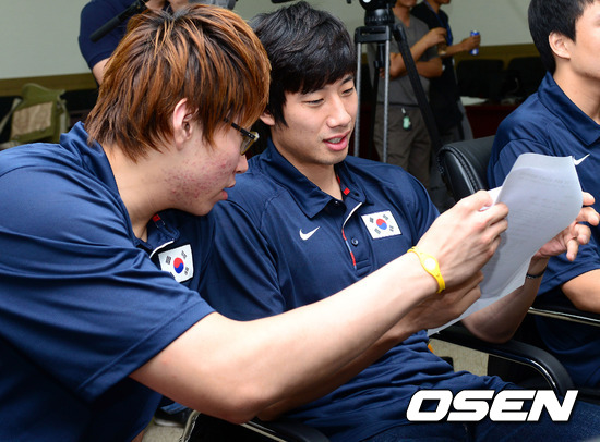 남자 농구대표팀 결단식이 15일 서울 올림픽파크텔 KOC회의실에서 열려 2012농구 국가대표팀 오세근과 양희종이 이야기를 나누고 있다.