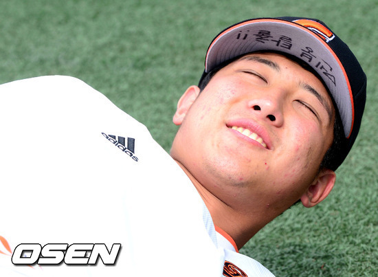 15일 오후 서울 목동구장에서 열린 '2012 팔도 프로야구' 넥센 히어로즈와 롯데 자이언츠 경기전 롯데 자이언츠 황재균의 모자에 멘붕 탈출이라는 문구가 눈길을 끈다.