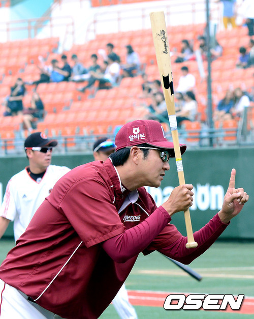 15일 오후 서울 목동구장에서 열린 '2012 팔도 프로야구' 넥센 히어로즈와 롯데 자이언츠 경기전 넥센 정민태 코치가 롯데 박정태 코치의 타격자세를 흉내내고 있다.
