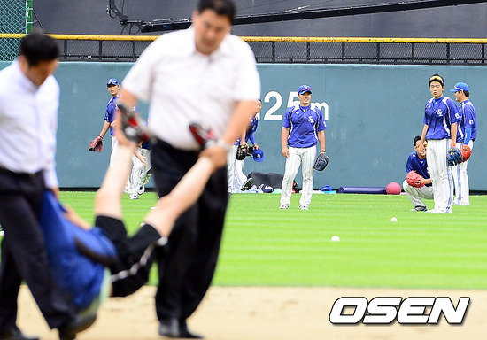 15일 오후 서울 잠실구장에서 열리는 2012 팔도 프로야구 두산 베어스와 삼성 라이온즈의 경기 전 삼성 선수들이 관중이 그라운드 난입을 바라보고 있다.