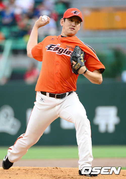 15일 오후 인천 문학야구장에서 열린 '2012 팔도 프로야구' SK 와이번스와 한화 이글스의 경기, 1회말 한화 선발 양훈이 힘차게 공을 던지고 있다.