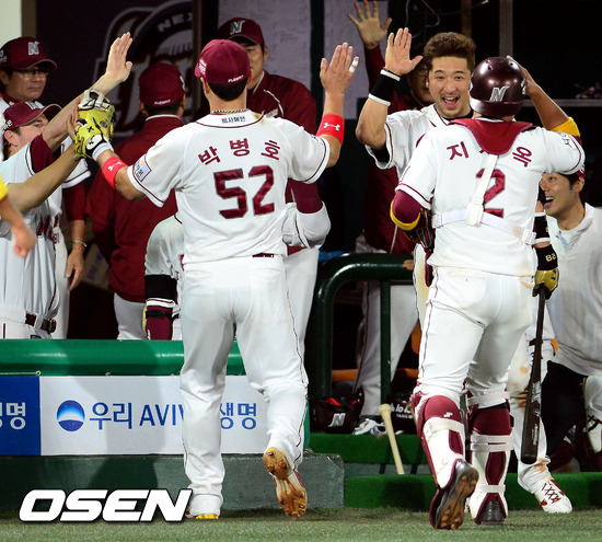 15일 오후 서울 목동구장에서 열린 '2012 팔도 프로야구' 넥센 히어로즈와 롯데 자이언츠 경기, 7회초 1사 만루 롯데 전준우의 타구를 병살처리하고 넥센 선수들이 덕아웃에서 기뻐하고 있다.