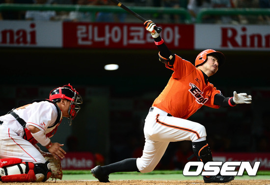 15일 오후 인천 문학야구장에서 열린 '2012 팔도 프로야구' SK 와이번스와 한화 이글스의 경기, 8회초 2사 2,3루 한화 한상훈이 헛스윙 삼진을 당하고 있다.
