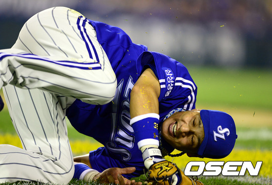 15일 오후 서울 잠실구장에서 열린 2012 팔도 프로야구 두산 베어스와 삼성 라이온즈의 경기 8회말 무사 2루 삼성 이승엽이 두산 윤석민의 번트 타구를 놓치고 있다..