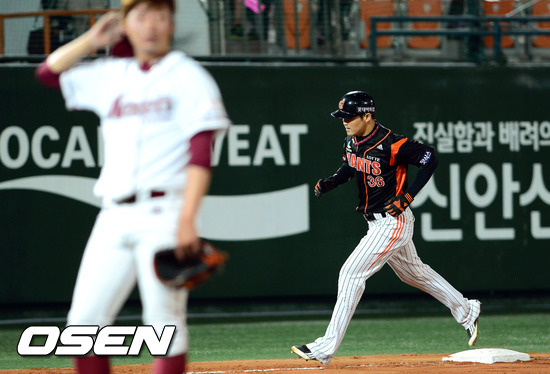 15일 오후 서울 목동구장에서 열린 '2012 팔도 프로야구' 넥센 히어로즈와 롯데 자이언츠 경기, 8회초 2사 롯데 박종윤이 우측 담장을 넘기는 솔로 홈런을 치고 베이스를 돌고 있다.