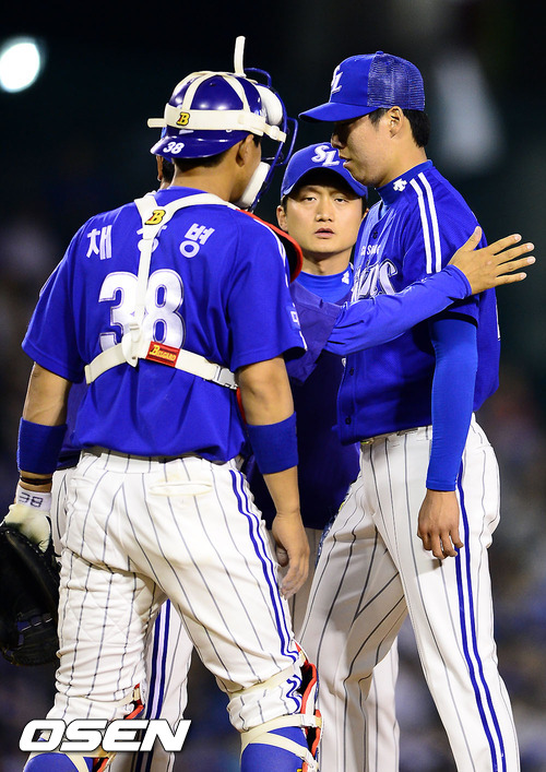 15일 오후 서울 잠실구장에서 열린 2012 팔도 프로야구 두산 베어스와 삼성 라이온즈의 경기 6회말 2사 2루 두산 양의지 타석때 삼성 선발투수 차우찬이 교체되고 있다. 5⅔이닝 3실점 기록했다.