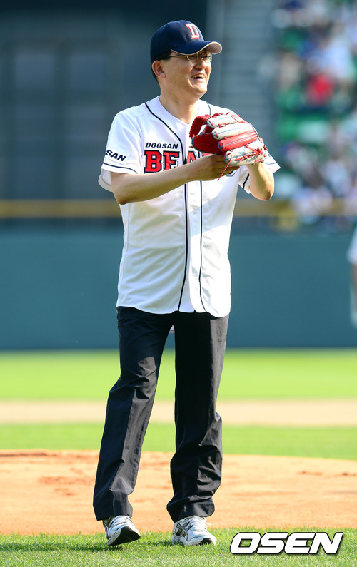 16일 오후 서울 잠실구장에서 열린 '2012 팔도 프로야구' 두산 베어스와 삼성 라이온스의 경기, 홍석우 지식경제부 장관이 시구를 마치고 즐거워하고 있다.