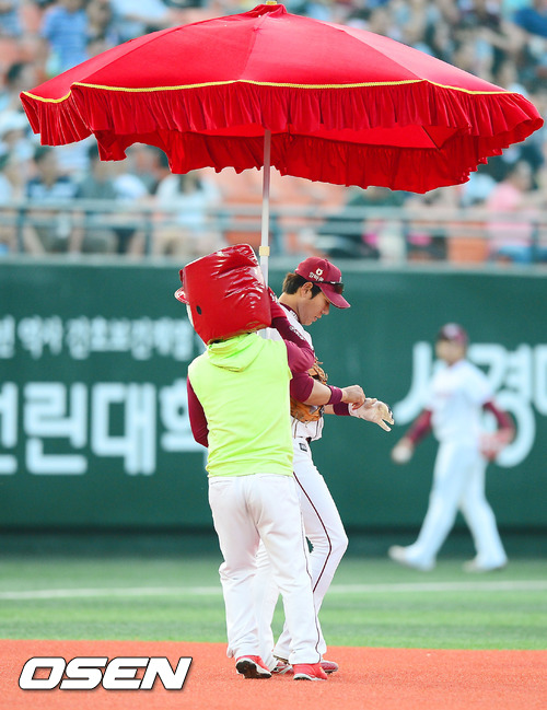 16일 오후 목동구장에서 열린 '2012 팔도 프로야구' 넥센 히어로즈와 롯데 자이언츠의 경기에서 7회초가 시작될때 6회말 무사 주자 1루 우월 동점 홈런(홈런 1위, 19호)을 날린 넥센 강정호를 턱돌이가 대형 우산을 씌워주고 있다.