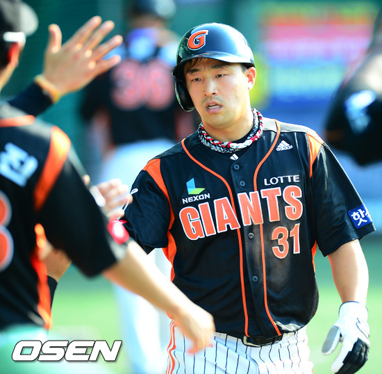 17일 오후 목동구장에서 열린 '2012 팔도 프로야구' 넥센 히어로즈와 롯데 자이언츠의 경기에서 1회초 무사 주자 2루 롯데 강민호의 우익수 오른쪽 1타점 적시타때 홈을 밟은 손아섭이 덕아웃에서 동료들과 하이파이브를 하고 있다.