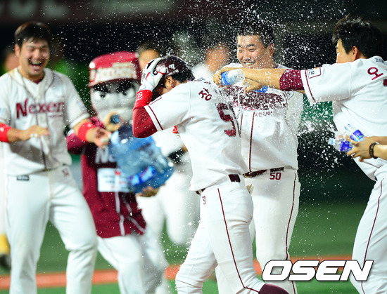 9회말 1사 주자 1,2루에서 넥센 장기영의 투수 앞 땅볼때 롯데 유격수 양종민이 2루에서 넥센 지석훈을 포스아웃 시킨후 1루로 송구할때 실책을 하며 경기가 끝났다. 동료들이 장기영에게 끝내기 물세례를 뿌리고 있다./ rumi@osen.co.kr
