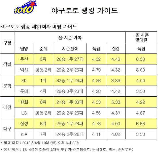 국민체육진흥공단(www.kspo.or.kr)이 발행하는 체육진흥투표권 수탁사업자인 스포츠토토 공식 온라인 발매 사이트인 베트맨(www.betman.co.kr)이 19일 오후 6시 30분에 열리는 2012 프로야구 4경기 8개팀을 대상으로 한 야구토토 랭킹 31회차 스트레이트 게임을 중간집계한 결과, 참가자들은 SK(50.69%), 넥센(48.39%), 삼성(43.98%) 순으로 다득점 상위 3개팀을 꼽았다. 반면 한화(23.38%)와 KIA(21.47%)는 가장 적은 득점을 기록할 것으로 예상됐다.