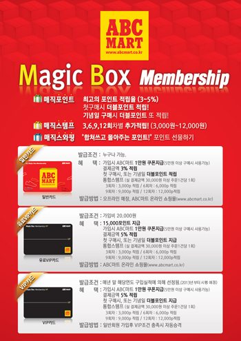 신발 멀티스토어 ABC마트는 5월, 높은 포인트 적립률의 ‘매직박스’ 멤버십을 론칭했다. 매직박스에 가입하면 기본적으로 3~5% 포인트를 적립해 주고, 구매 3회 차에는 3천, 6회 차에는 6천, 9회 차에는 9천, 12회 차에는 1만2천 포인트를 추가로 적립해 주는 ‘매직 스탬프’서비스를 제공받을 수 있다.