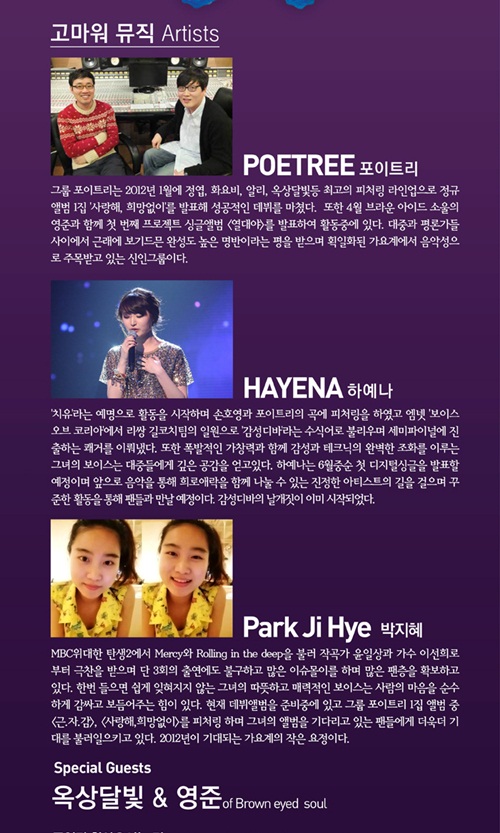 또한 포이트리 1집 앨범 피처링에 참여했던 그룹 브라운 아이드 소울의 영준과 옥상달빛이 게스트로 무대를 빛낸다.