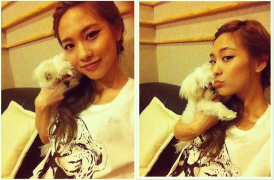 걸그룹 미쓰에이의 페이가 같은 그룹 멤버 수지의 애견 데이먼에게 뽀뽀하는 모습이 담긴 애교 셀카를 공개했다.